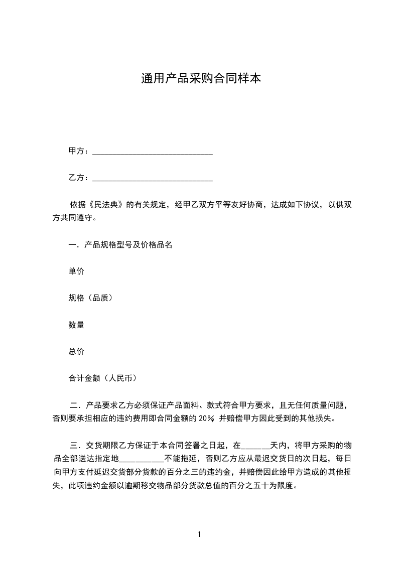 二.产品要求乙方必须保证产品面料、款式符合甲方要求,且无任何质量问题,否则要承担相应的违约费用即合同金额的20%,并赔偿甲方因此受到的其他损失。