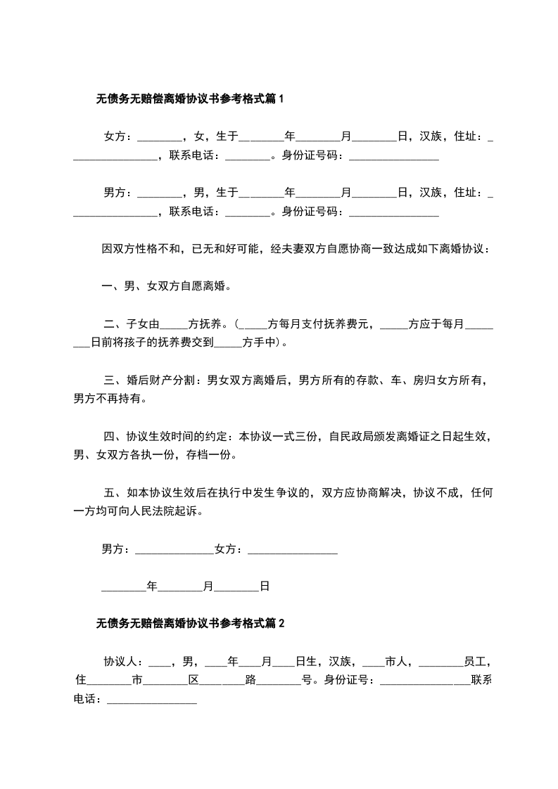 无债务无赔偿协议离婚书模板篇2