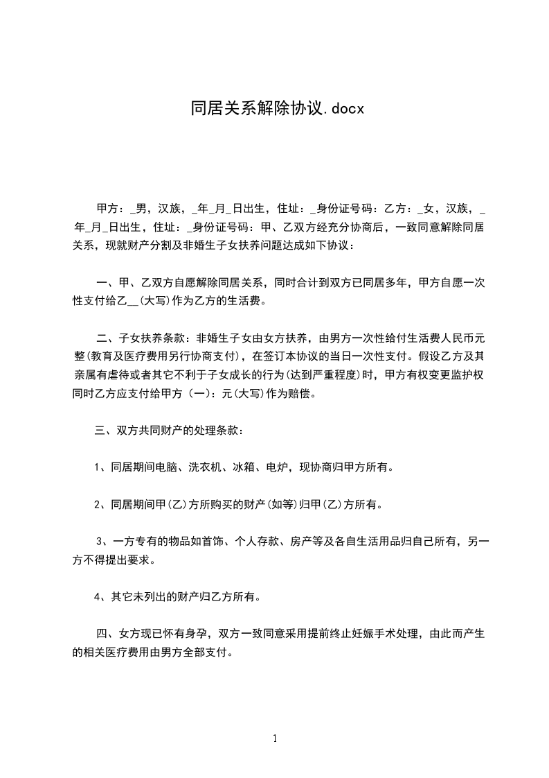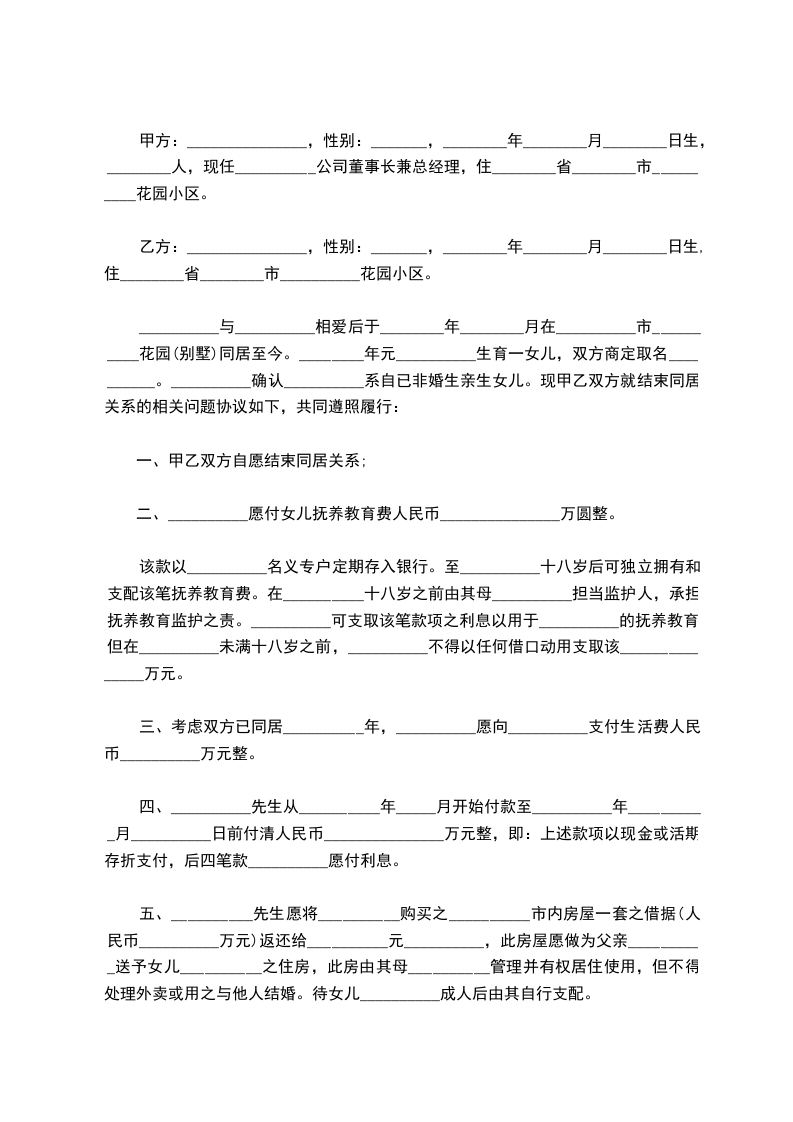 男女双方系恋爱关系,于2024年举办婚礼,并于同居期间生育一女_____,现年______岁。经双方充分协商后,一致同意解除同居关系,现就财产分割及非婚生子女抚养问题达成如下协议:__________
