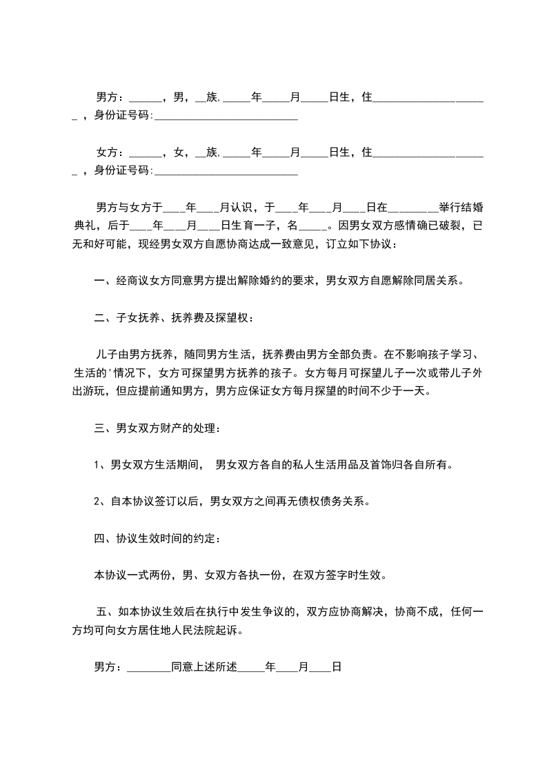 1、双方共同约定非婚生子______(身份证号:__________________________)由男方抚养。女方不支付抚养费。