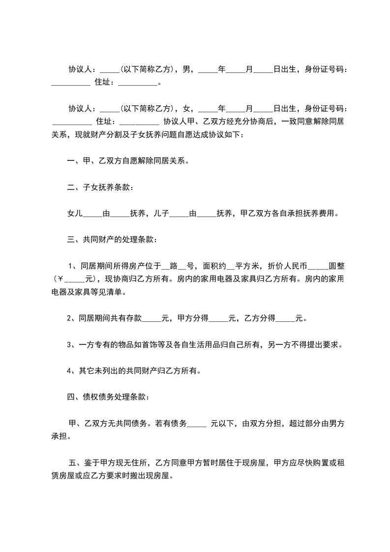 男女双方自愿解除同居关系,___方应于本协议签订后______日内搬出____方住房,房屋地址位于__________________________。