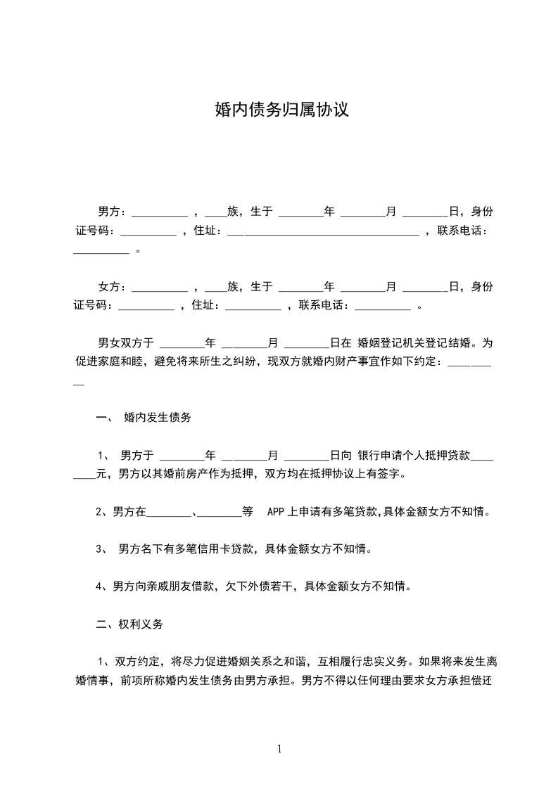 1、双方约定,将尽力促进婚姻关系之和谐,互相履行忠实义务。如果将来发生离婚情事,前项所称婚内发生债务由男方承担。男方不得以任何理由要求女方承担偿还义务。如若男方迟延履行导致女方因债务人追索而承担任何形式的法律责任,女方有权依据本协议之约定向男方主张赔偿。