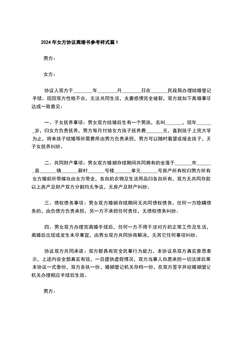2024年女方协议离婚书参考样式篇1