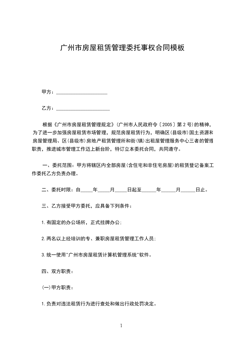 根据《广州市房屋租赁管理规定》(广州市人民政府令〔2005〕第2号)的精神,为了进一步加强房屋租赁市场管理,规范房屋租赁行为,明确区(县级市)国土资源和房屋管理局、区(县级市)房地产租赁管理所和街(镇)出租屋管理服务中心三者的管理职责,推进城市管理工作迈上新台阶,特订立本委托合同,共同遵守。
