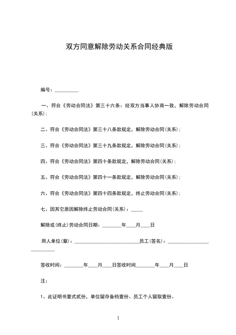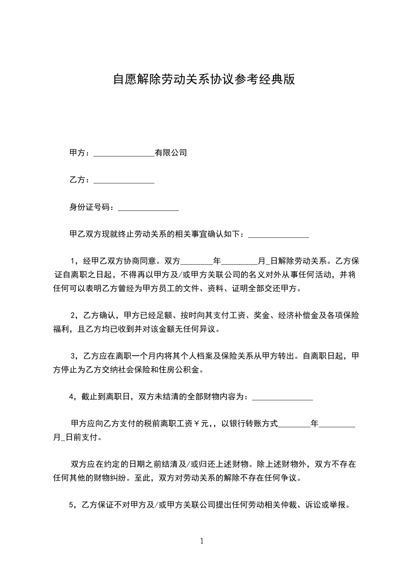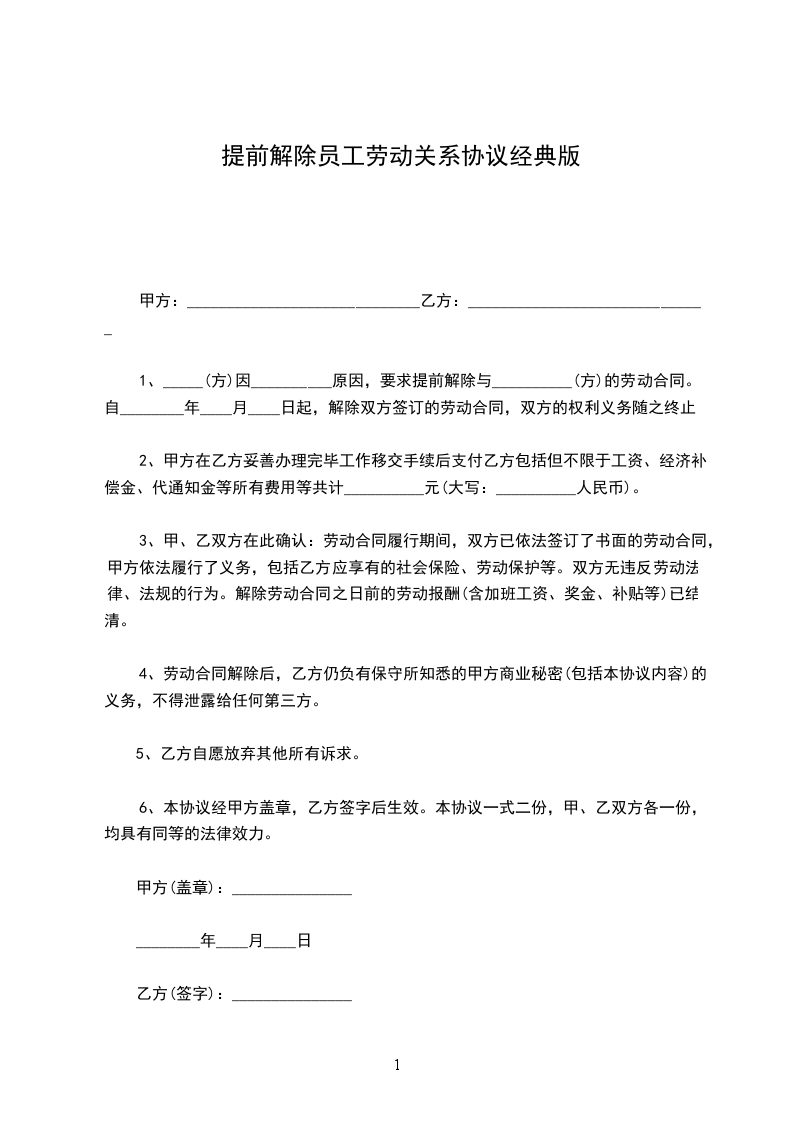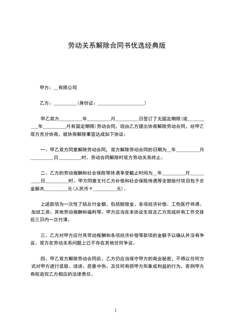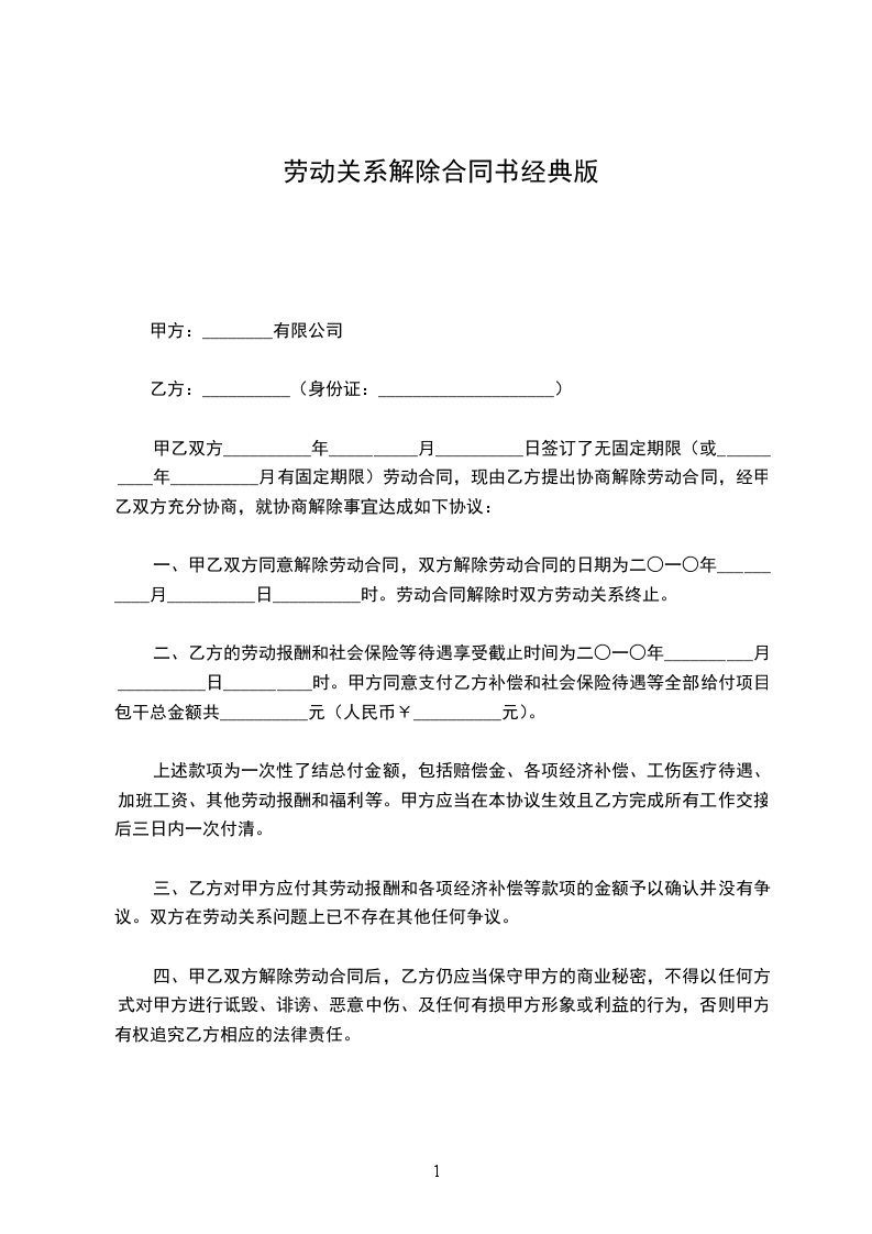 甲、乙双方就解除劳动关系事宜,经平等协商后,自愿达成如下一致协议:__________