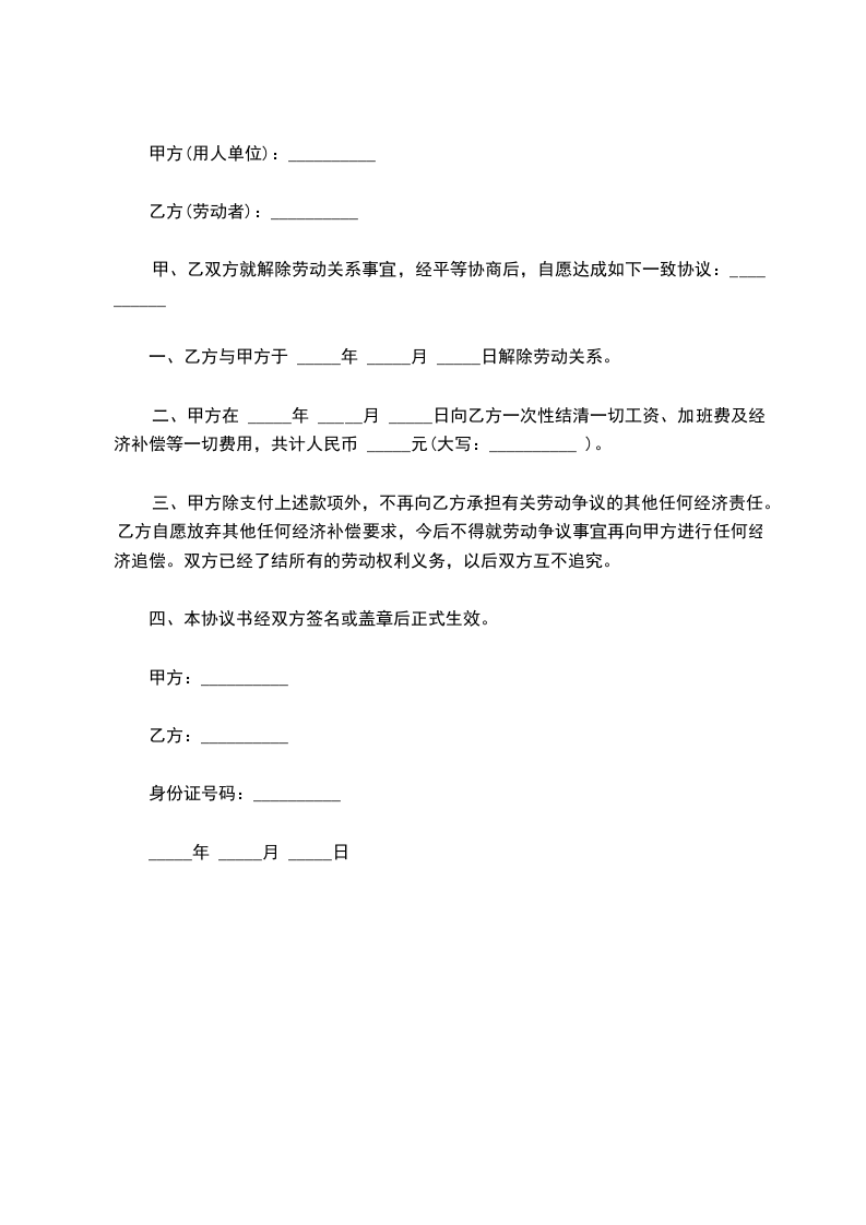 二、甲方在 _____年 _____月 _____日向乙方一次性结清一切工资、加班费及经济补偿等一切费用,共计人民币 _____元(大写:__________ )。