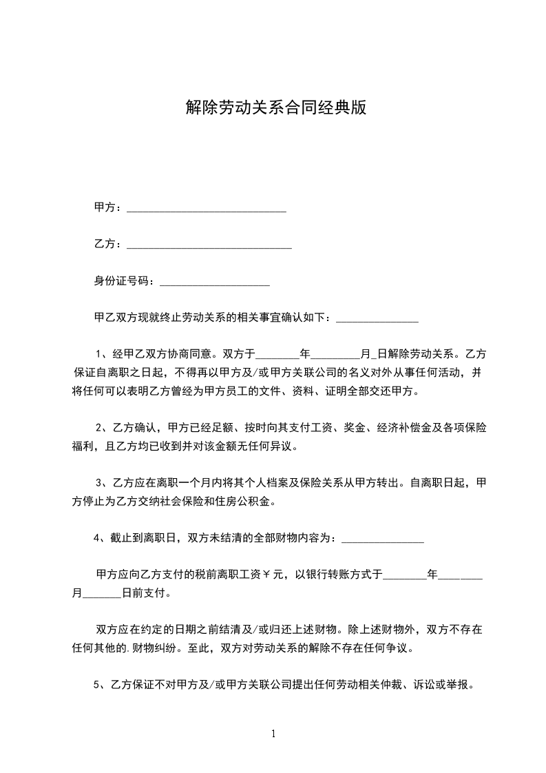 一、乙方与甲方于 _____年 _____月 _____日解除劳动关系。