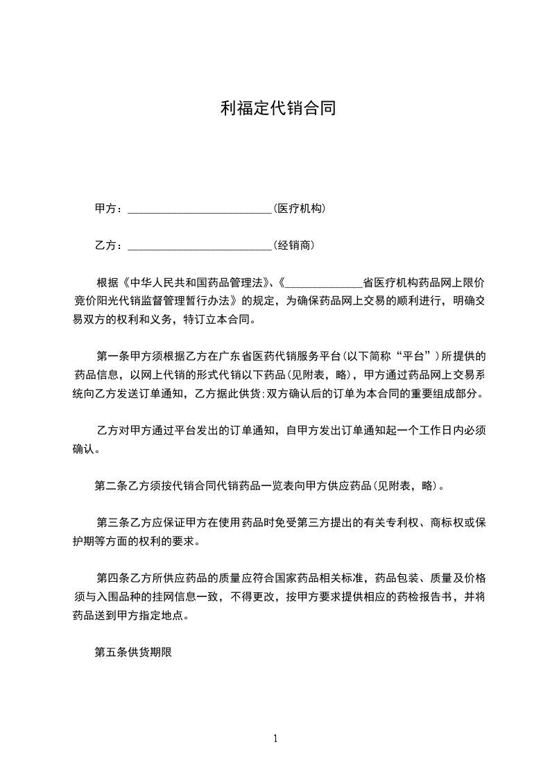 根据《中华人民共和国药品管理法》、《______________省医疗机构药品网上限价竞价阳光代销监督管理暂行办法》的规定,为确保药品网上交易的顺利进行,明确交易双方的权利和义务,特订立本合同。
