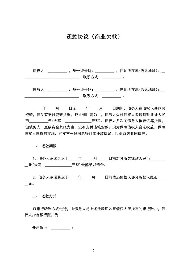 _____年_____月_____日至_____年_____月_____日期间,债务人在债权人处购买瓷砖,但没有支付瓷砖货款,截止到目前为止,债务人欠付债权人瓷砖货款共计人民币__________元(大写:______________元整)。债权人多次向债务人催要该笔货款,但债务人一直以资金紧张为由,没有支付该笔货款。现为保障债权人合法权益,保障债权人债权的实现,经双方一致同意签订本还款协议,以资双方共同遵守。