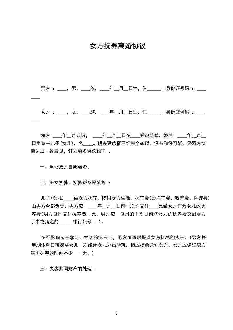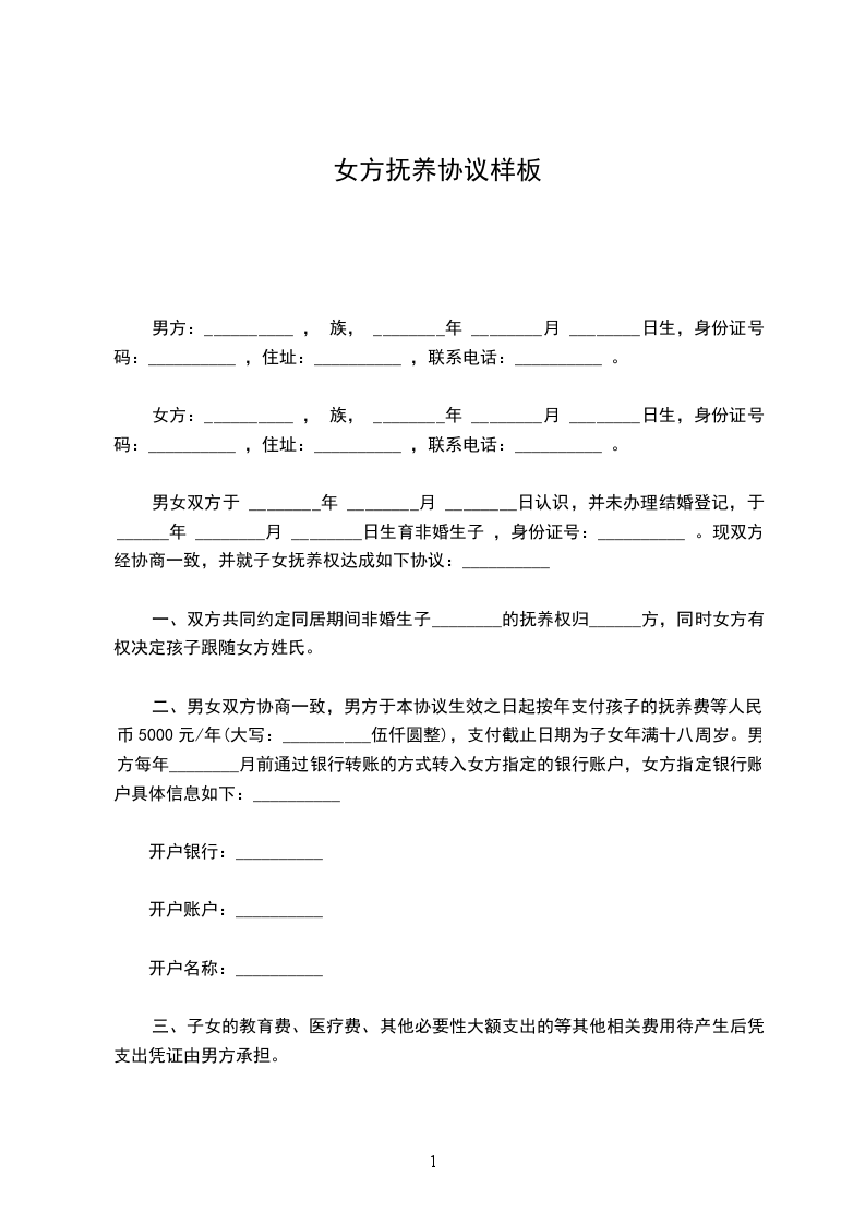 女方:__________ , 族, ________年 ________月 ________日生,身份证号码:__________ ,住址:__________ ,联系电话:__________ 。