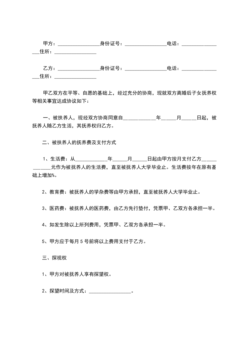 二、男女双方协商一致,男方于本协议生效之日起按年支付孩子的抚养费等人民币5000元/年(大写:__________伍仟圆整),支付截止日期为子女年满十八周岁。男方每年________月前通过银行转账的方式转入女方指定的银行账户,女方指定银行账户具体信息如下:__________