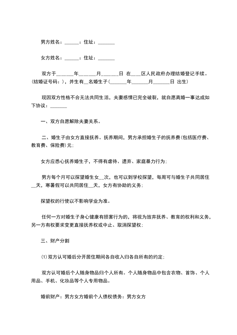 男方:__________ , 族, ________年 ________月 ________日生,身份证号码:__________ ,住址:__________ ,联系电话:__________ 。