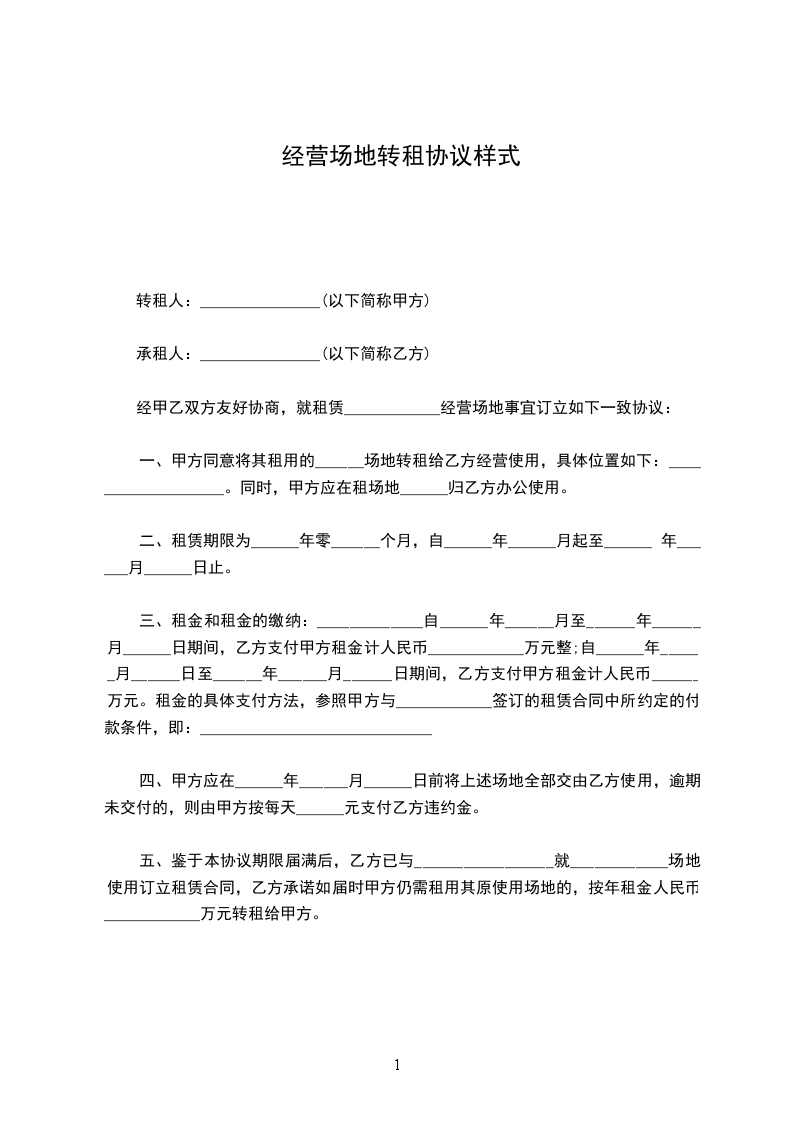 一、甲方同意将其租用的______场地转租给乙方经营使用,具体位置如下:___________________。同时,甲方应在租场地______归乙方办公使用。