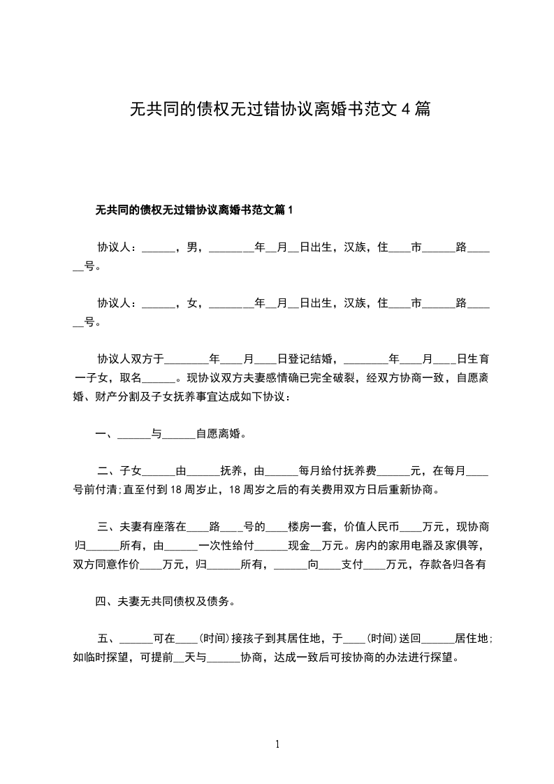 无共同的债权无过错协议离婚书范文篇1