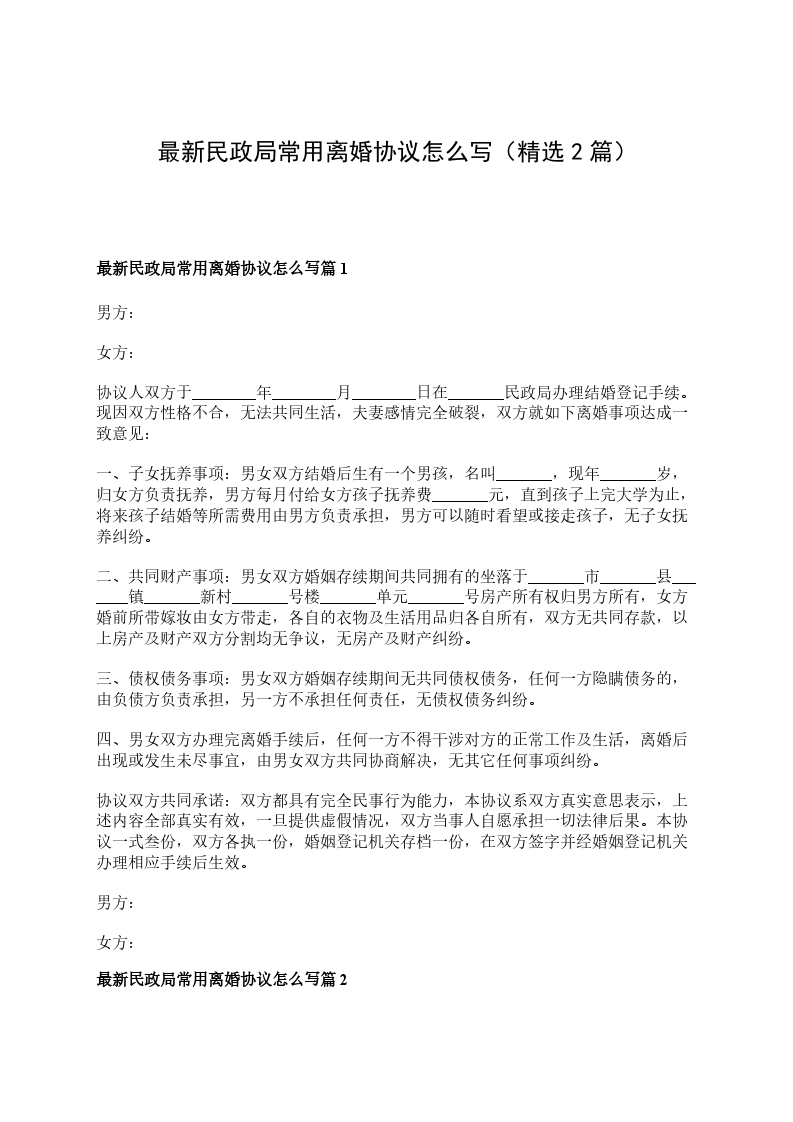 最新民政局常用协议离婚书参考样板篇2