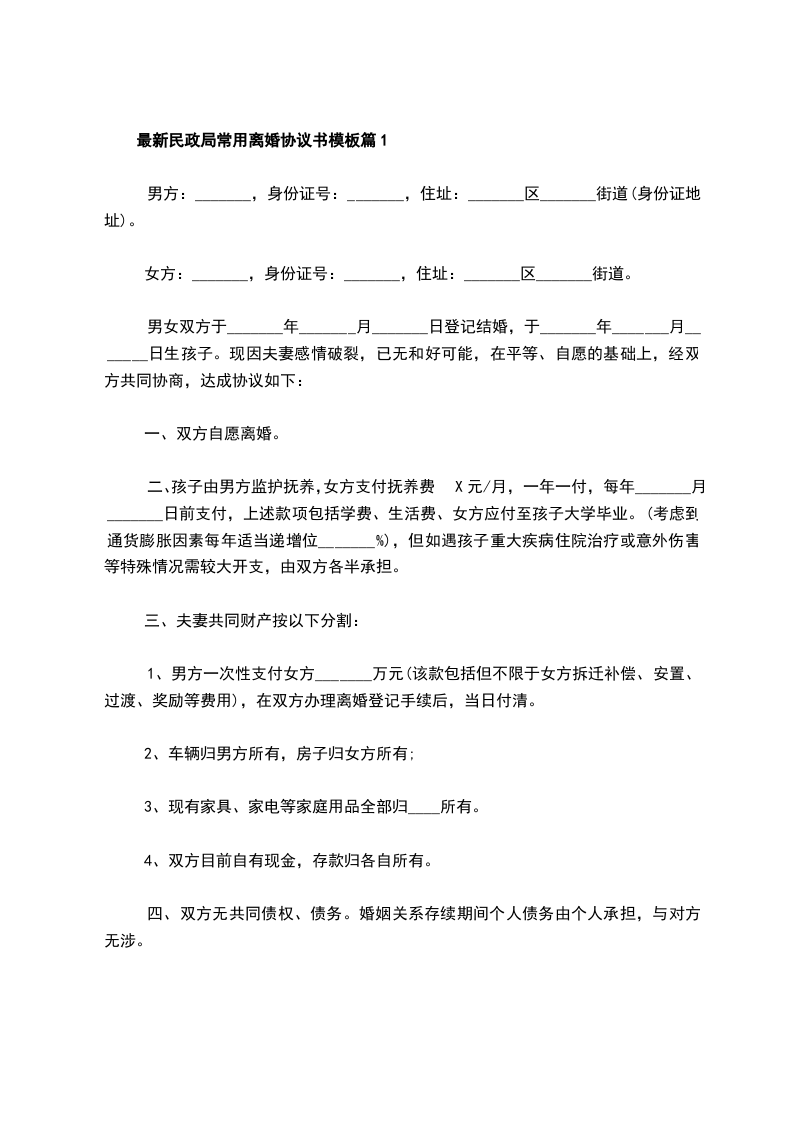 最新民政局常用协议离婚书参考样板篇1