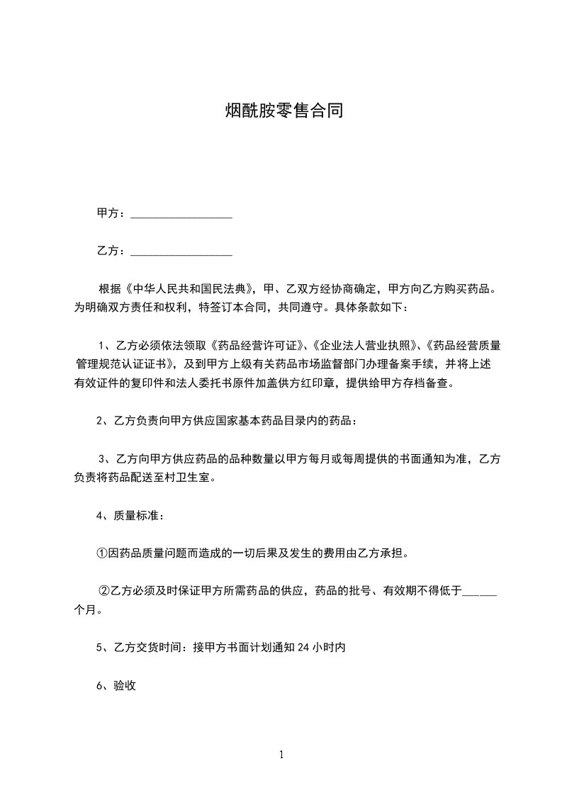 根据《中华人民共和国民法典》,甲、乙双方经协商确定,甲方向乙方购买药品。为明确双方责任和权利,特签订本合同,共同遵守。具体条款如下: