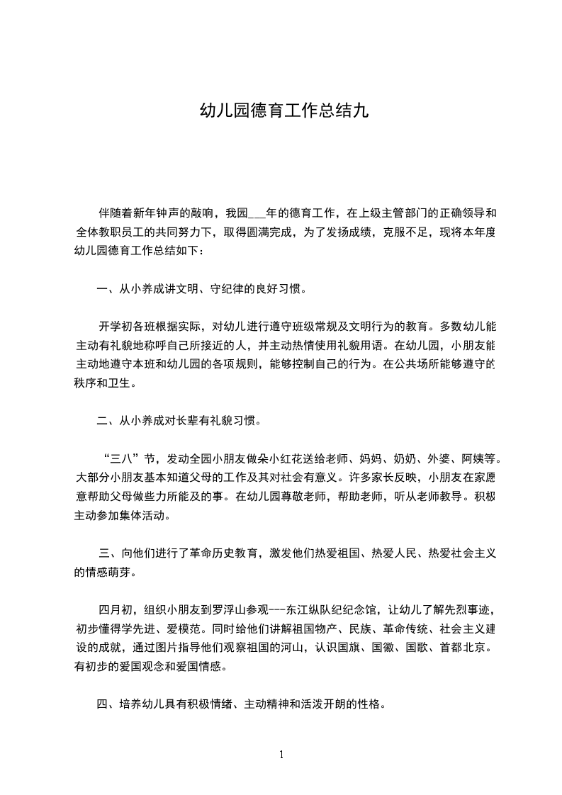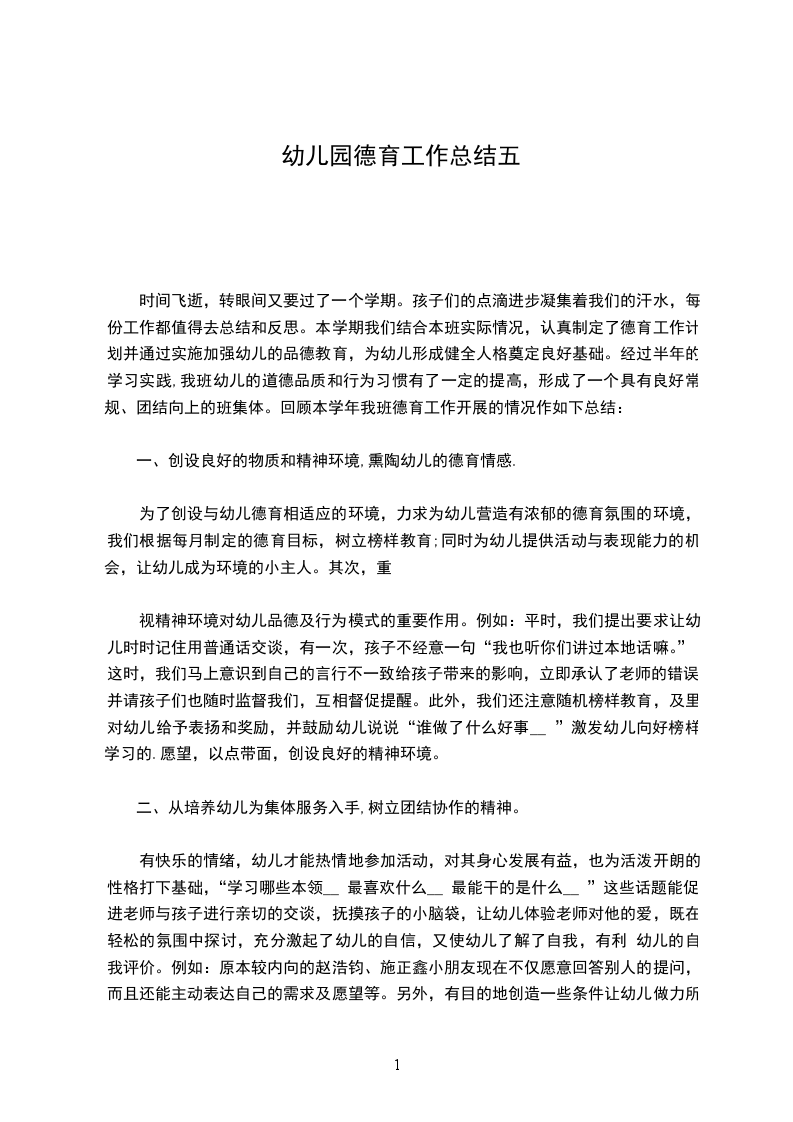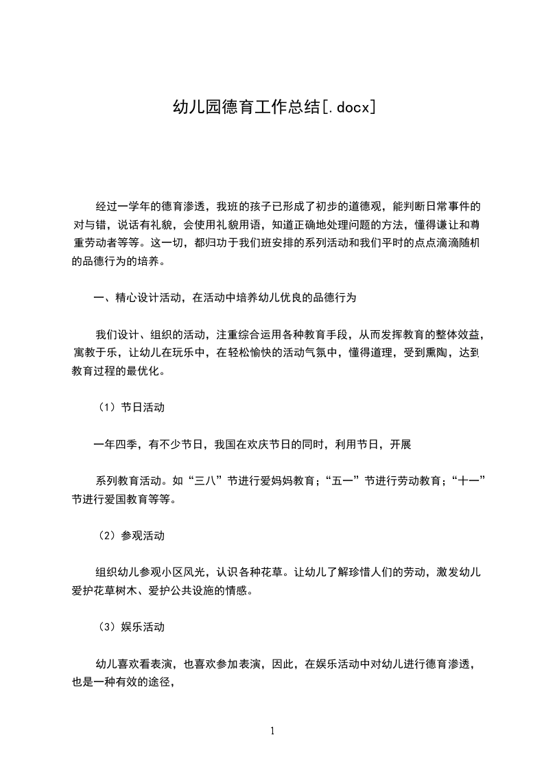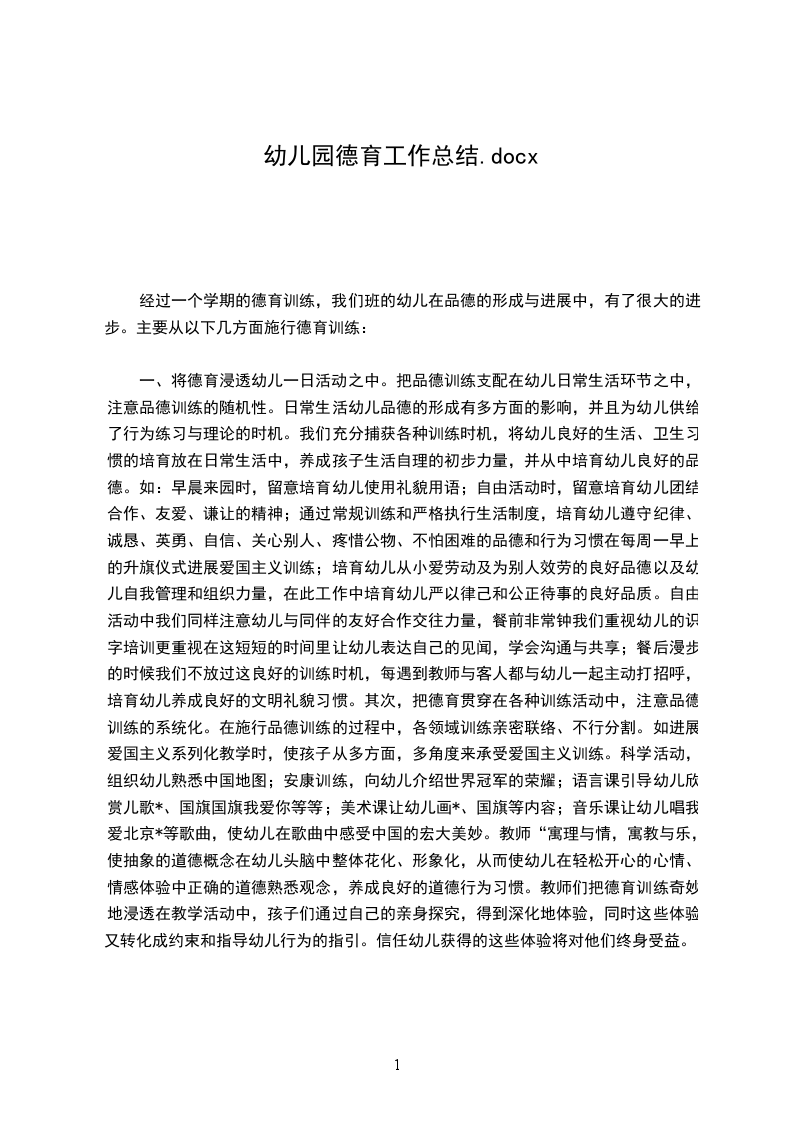 德育教育是学前教育的重要组成部分,是有目的、有组织地塑造儿童心灵的活动。幼儿期是人格开始形成的基础阶段,适时适度的品德教育将为形成、发展、巩固幼儿良好的个性奠定基础。幼儿的身心发展特点决定了幼儿可塑性大,容易接受各种思想的影响。这一时期对幼儿施以良好的教育的潜移默化的影响,激发幼儿积极的心理状态是幼儿形成正确思想情感和良好品德修养的关键。本学期,我认真研究幼儿心理特点,努力学习幼儿教育理论,在幼儿德育教育上获得了很在的收获。一学期来,我园在《幼儿园教育指导纲要》、《指南》精神的指导下,积极推进素质教育,突出爱国主义,集体主义,社会主义和文明行为习惯养成教育,现将本学期的德育工作小结如下:一、在系列化的活动中进行品德教育。