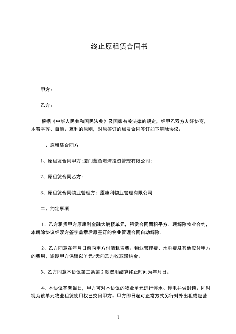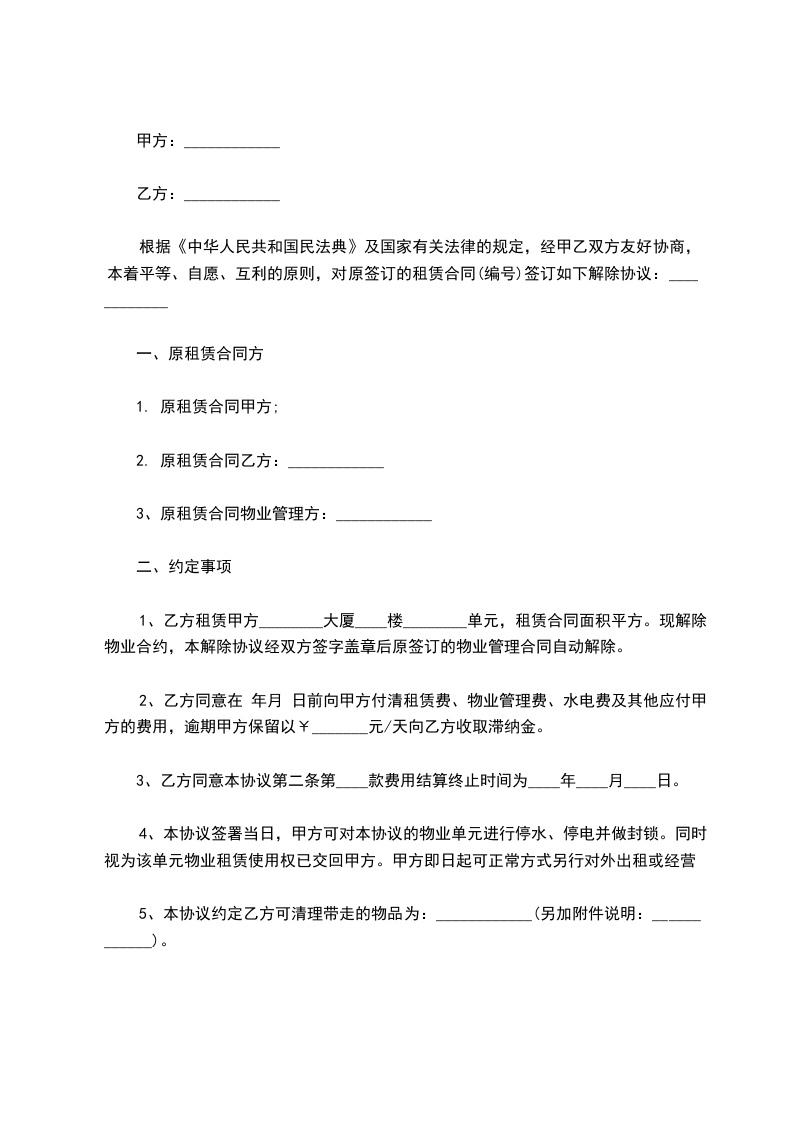 根据《中华人民共和国民法典》及国家有关法律的规定,经甲乙双方友好协商,本着平等、自愿、互利的原则,对原签订的租赁合同(编号)签订如下解除协议:____________