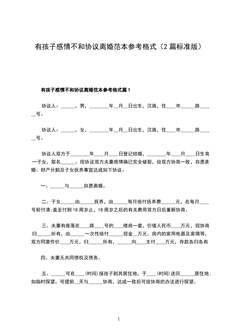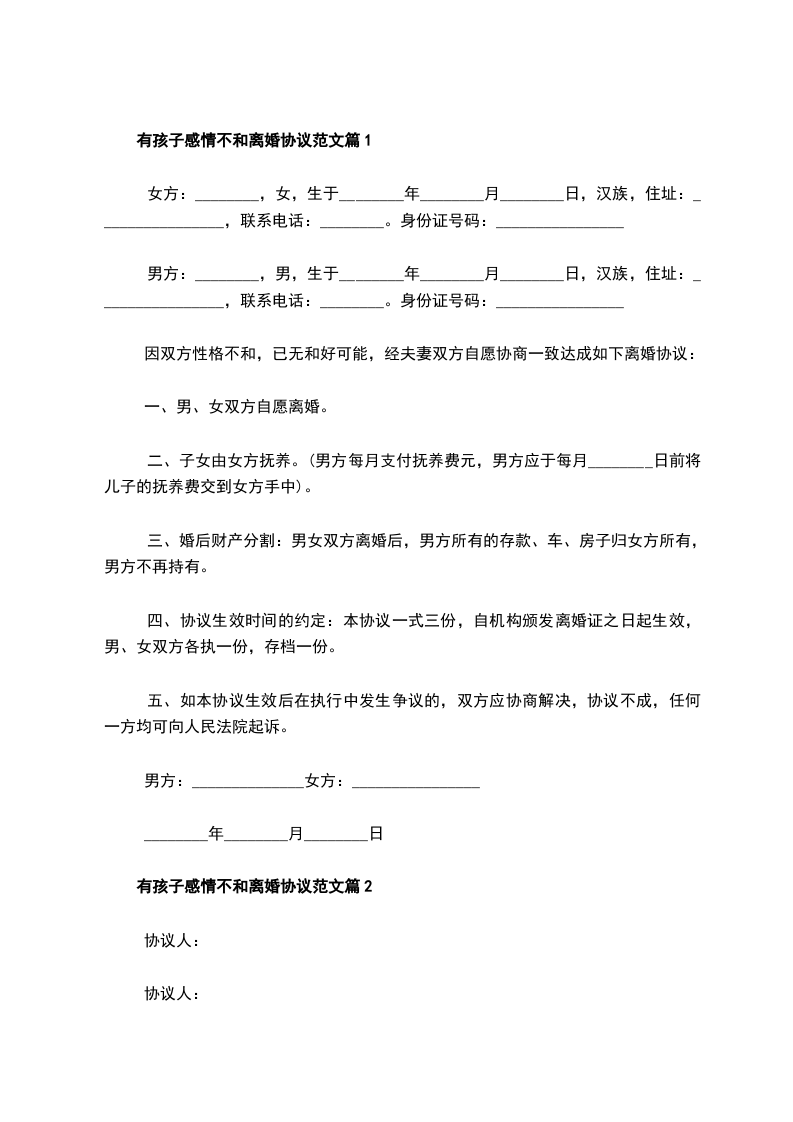 有孩子感情不和协议离婚书范文篇2