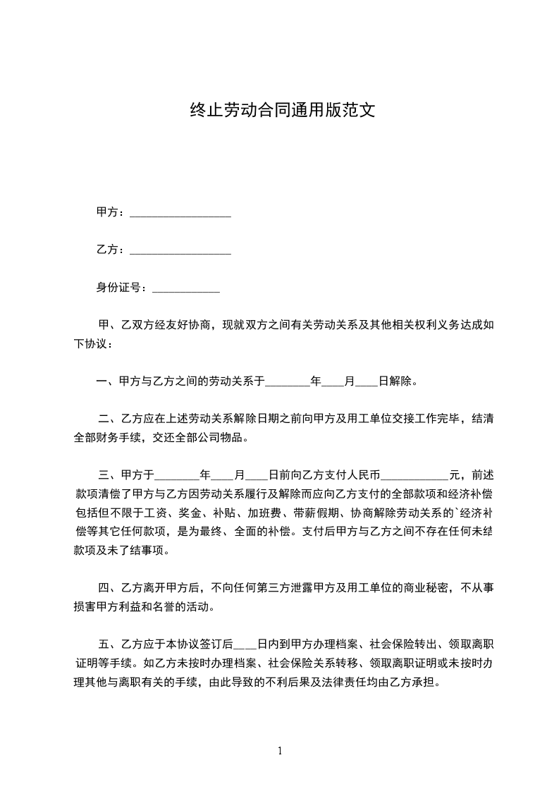 三、甲方于________年____月____日前向乙方支付人民币____________元,前述款项清偿了甲方与乙方因劳动关系履行及解除而应向乙方支付的全部款项和经济补偿,包括但不限于工资、奖金、补贴、加班费、带薪假期、协商解除劳动关系的`经济补偿等其它任何款项,是为最终、全面的补偿。支付后甲方与乙方之间不存在任何未结款项及未了结事项。