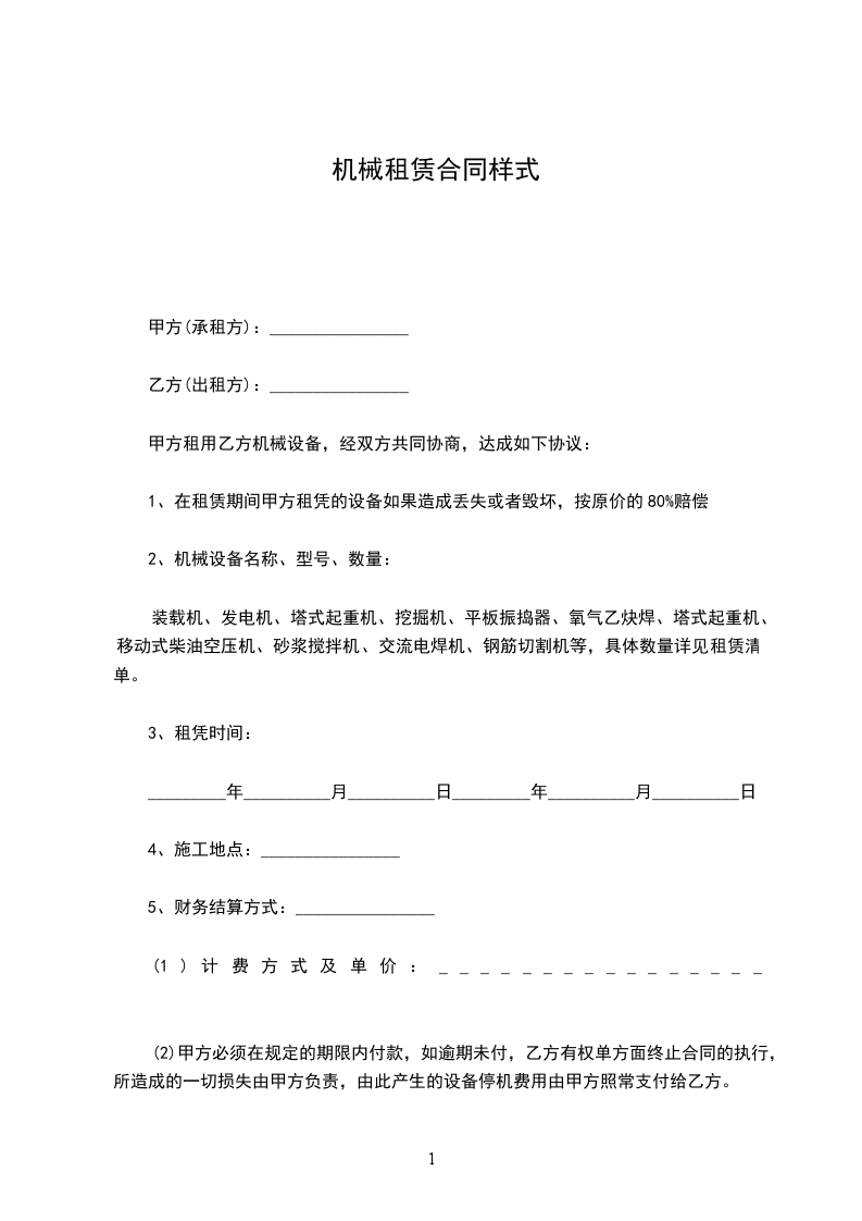 1、在租赁期间甲方租凭的设备如果造成丢失或者毁坏,按原价的80%赔偿