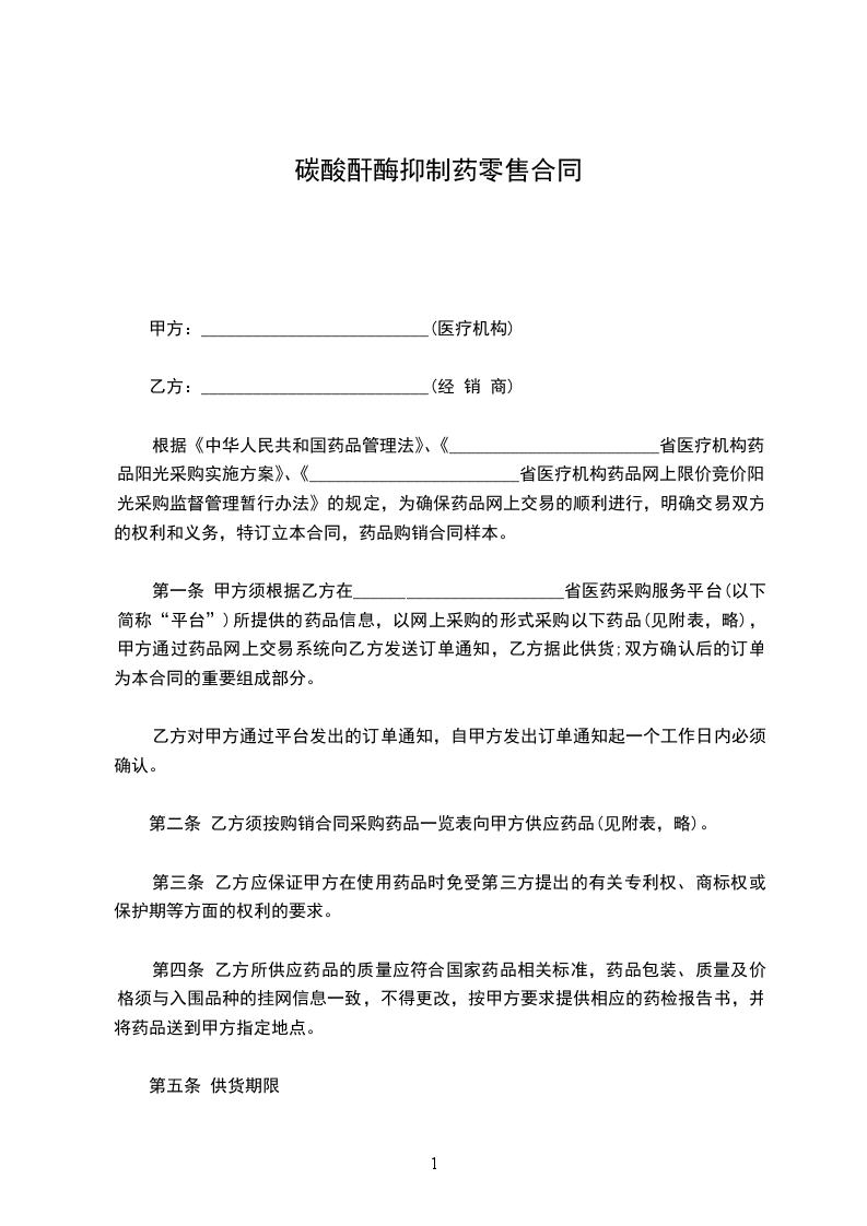 第一条 甲方须根据乙方在________________________省医药采购服务平台(以下简称“平台”)所提供的药品信息,以网上采购的形式采购以下药品(见附表,略),甲方通过药品网上交易系统向乙方发送订单通知,乙方据此供货;双方确认后的订单为本合同的重要组成部分。
