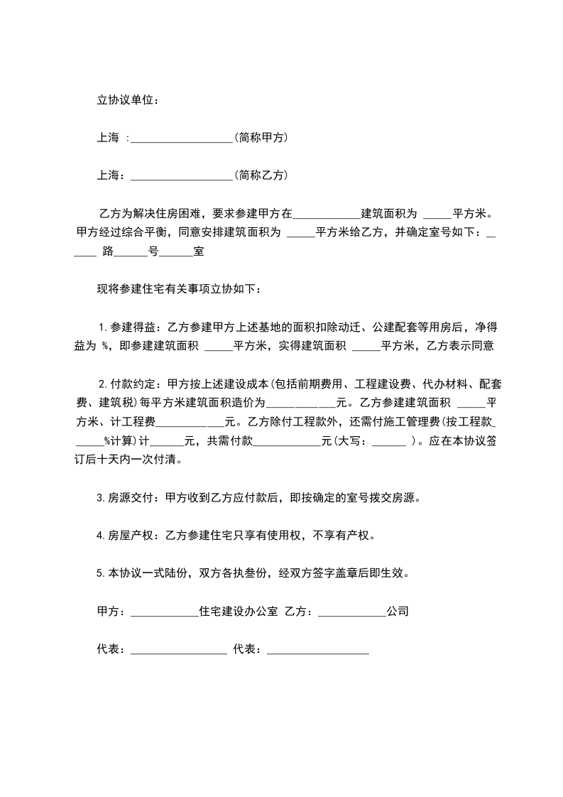 1.参建得益:乙方参建甲方上述基地的面积扣除动迁、公建配套等用房后,净得益为 %,即参建建筑面积 _____平方米,实得建筑面积 _____平方米,乙方表示同意。