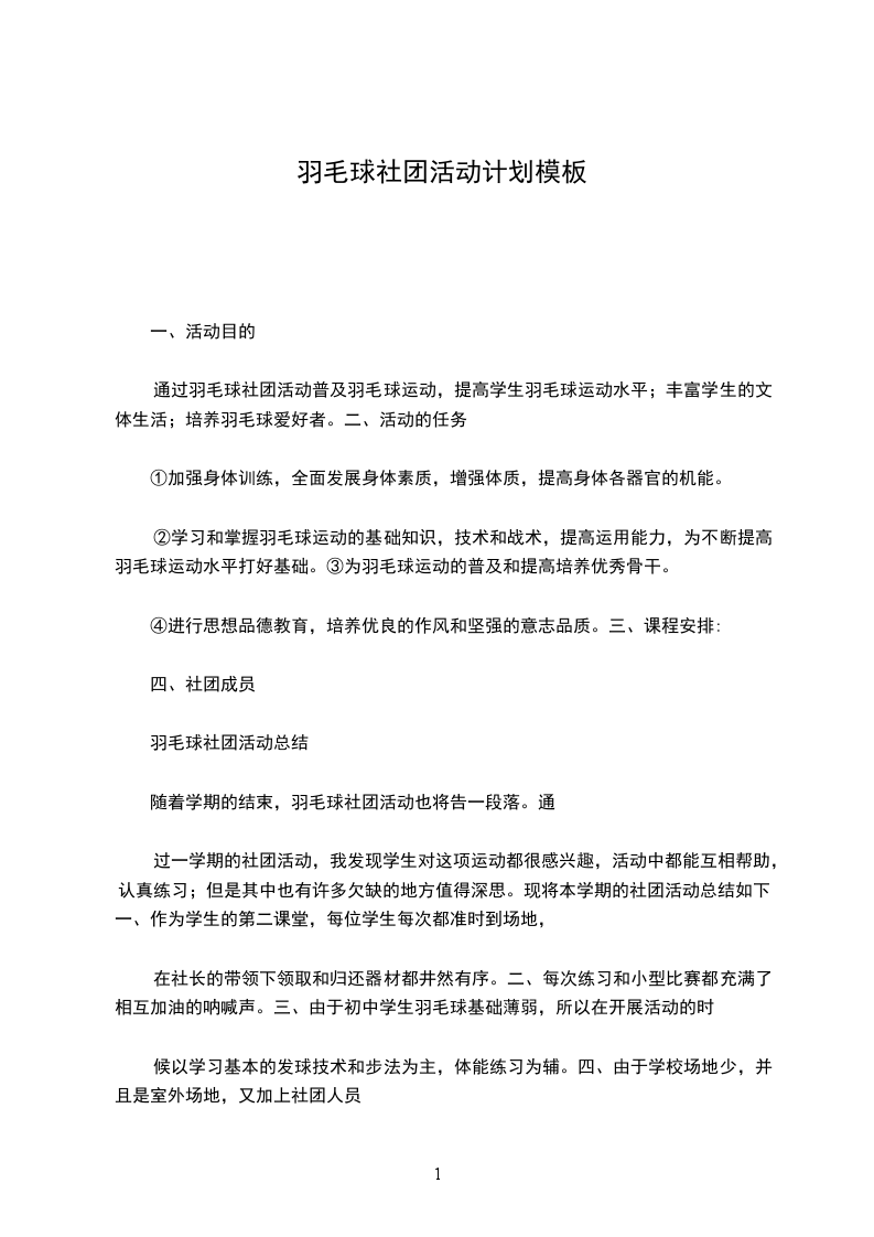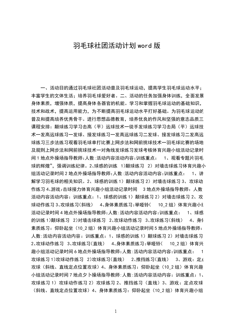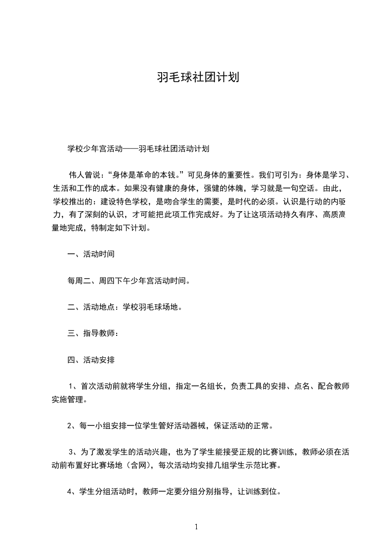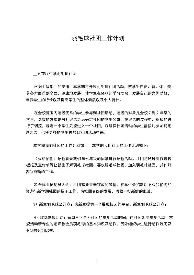根据上级部门的安排,本学期将开展羽毛球社团活动,使学生在德、智、体、美、劳各方面得到全面、健康地发展,使学生在紧张的学习之余,发展自己的兴趣爱好,培养学生的特长以及提高学生的整体素质以及个人特长。