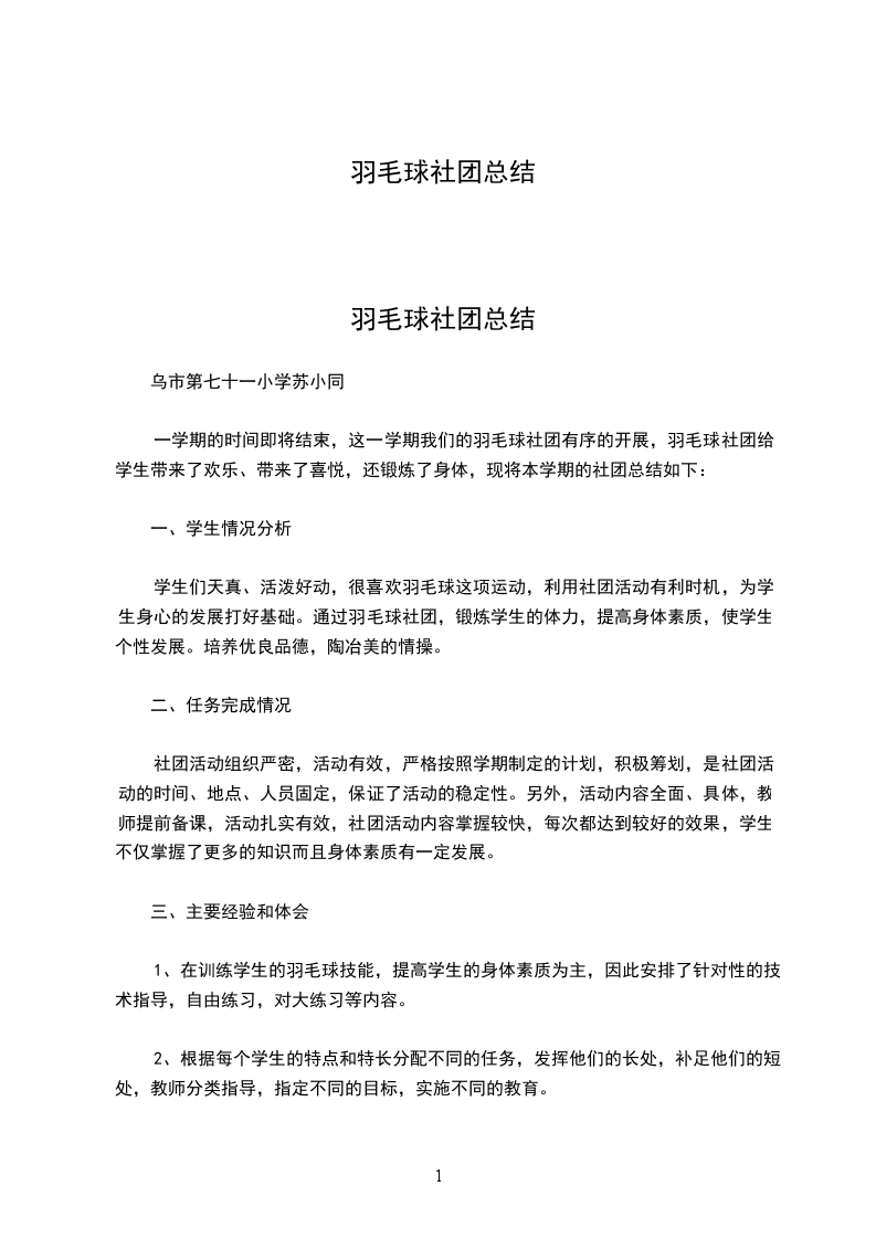 第二篇:羽毛球社团工作总结700字