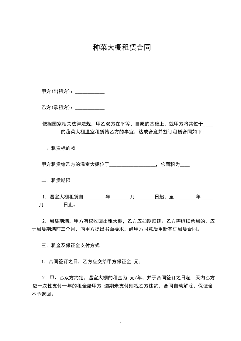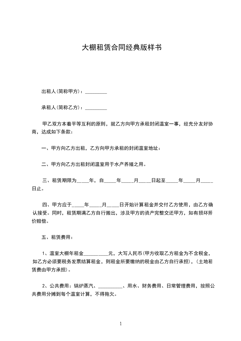1、温室大棚年租金__________元,大写人民币(甲方收取乙方租金为不含税金,如乙方必须要税务发票结算租金,则租金所要缴纳的税金由乙方自行承担),(土地租赁费由甲方承担)。