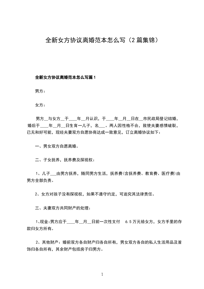 ⑴存款:双方名下现有银行存款共 元,双方各分一半,为 元。分配方式:各自名下的存款保持不变,但男方/女方应于 年 月 日前一次性支付 元给女方/男方。⑵房屋:夫妻共同所有的位于___的房地产所有权归女方所有, 房地产权证的业主姓名变更的手续自离婚后一个月内办理,男方必须协助女方办理变更的一切手续,过户费用由女方负责。女方应于 年 月 日前一次性补偿房屋差价 元给男方。