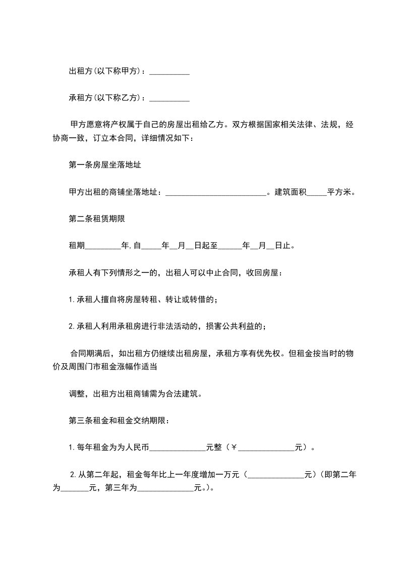 2.从第二年起,租金每年比上一年度增加__________元(即第二年为_____元,第三年为_____元,第四年为_____元,………)。