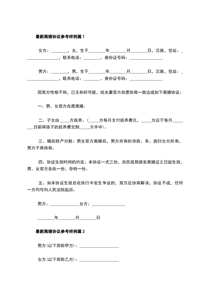 离婚协议参考样例篇2