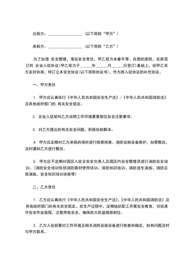 为了加强 安全管理,落实安全责任,甲乙双方本着平等、自愿的原则,在原签订的 企业入驻协议(甲乙双方于______年______月______日签订)基础上,经甲乙双方友好协商,特订立本安全协议(以下简称协议书),作为原入驻协议的补充协议。