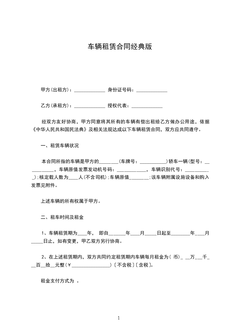 本合同所指的车辆是甲方的________(车牌号:___________)轿车一辆(型号:___________,车辆原值发票发动机号码:____________,车辆识别代号:___________);核定载人数为____人(不含司机);车辆原值________;该车辆附属设施设备和购入发票见附件。
