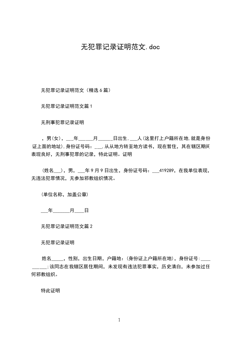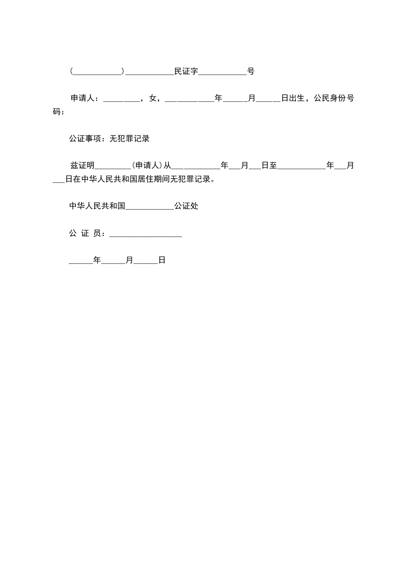 兹证明_________(申请人)从____________年___月___日至____________年___月___日在中华人民共和国居住期间无犯罪记录。