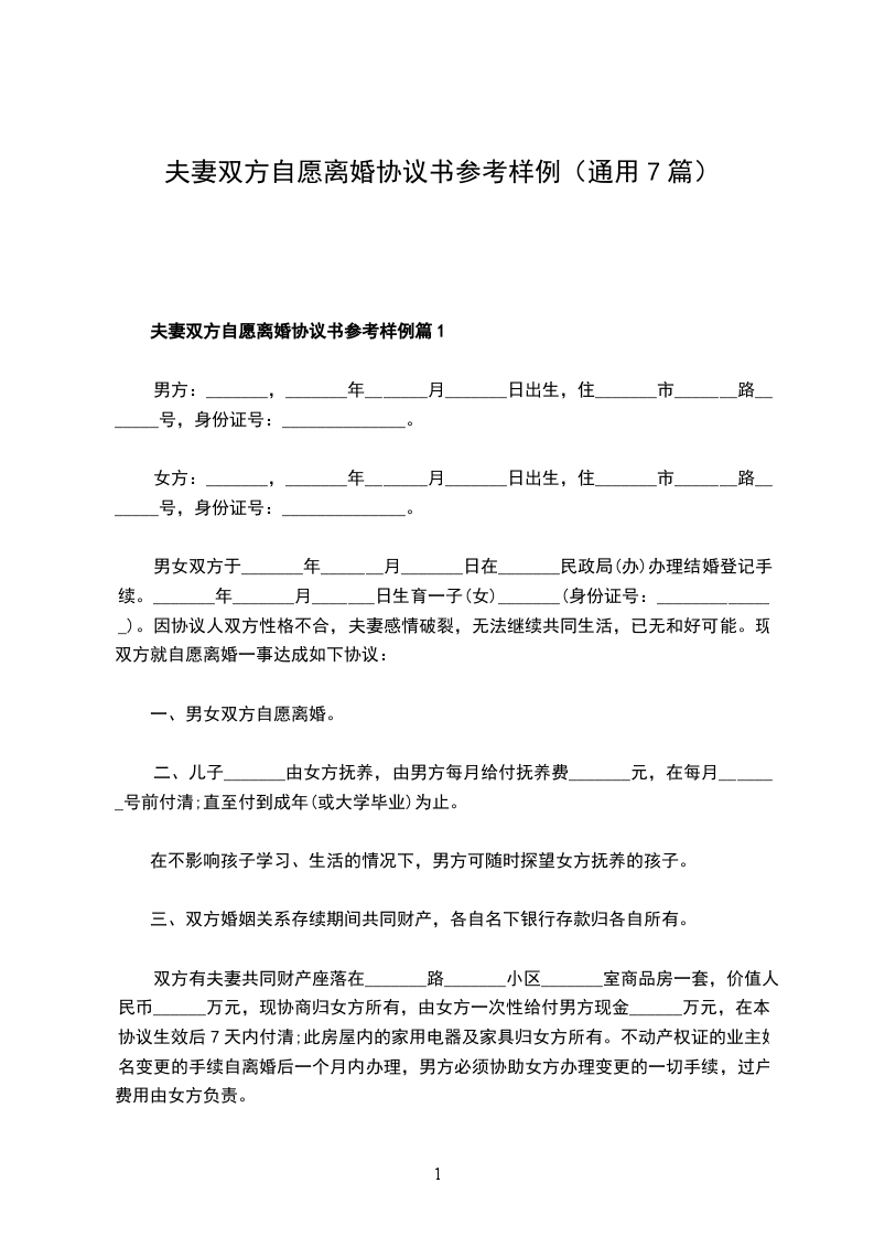 夫妻双方自愿离婚协议书参考样例篇1