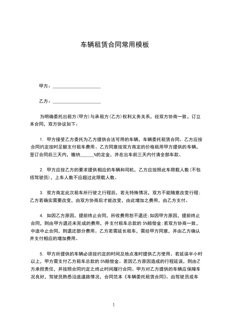 1. 甲方接受乙方委托为乙方提供合法可用的车辆,车辆委托租赁合同。乙方应按合同约定按时足额支付租车费用。乙方同意按双方商定的价格租用甲方提供的车辆,签订合同后三天内,缴纳______%的定金,并在出车前三天内付清全部车款。