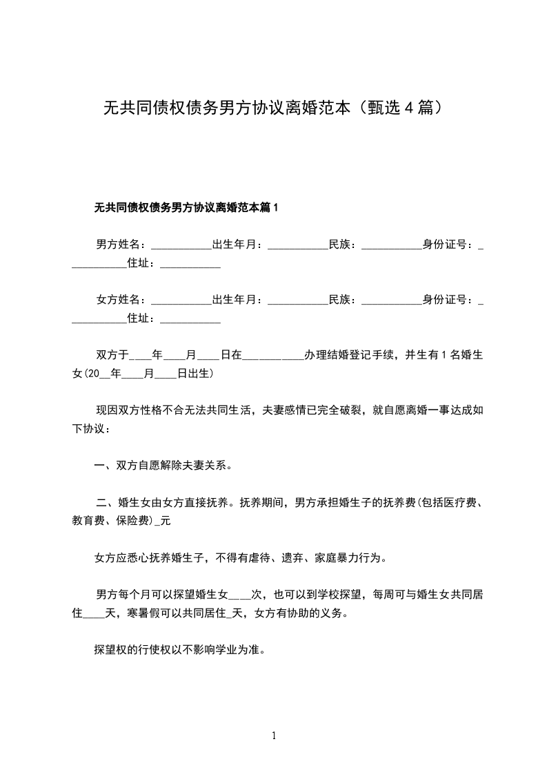 三、债权债务事项:男女双方婚姻存续期间无共同债权债务,任何一方隐瞒债务的,由负债方负责承担,另一方不承担任何责任,无债权债务纠纷。