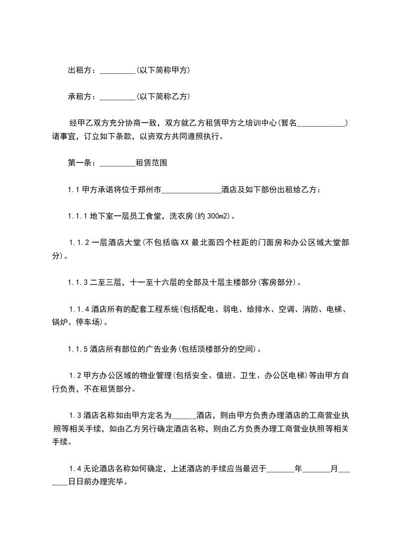 1.1甲方承诺将位于郑州市_______________酒店及如下部份出租给乙方:
