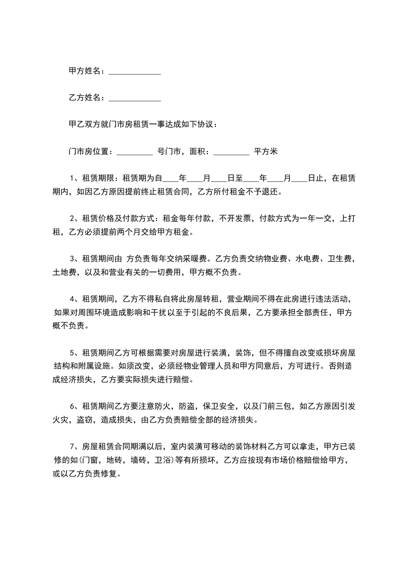 6、租赁期间乙方要注意防火,防盗,保卫安全,以及门前三包,如乙方原因引发火灾,盗窃,造成损失,由乙方负责赔偿全部的经济损失。
