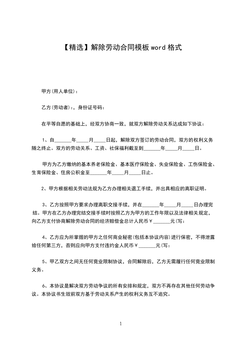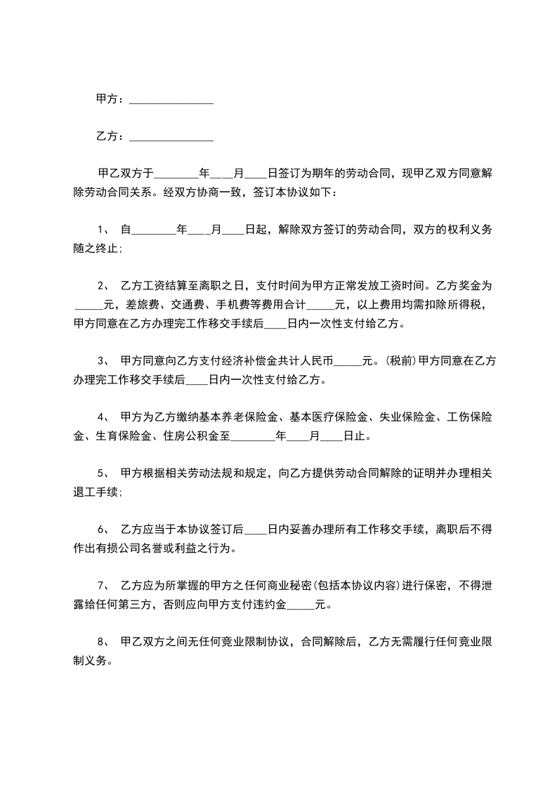 1、 自________年____月____日起,解除双方签订的劳动合同,双方的权利义务随之终止;