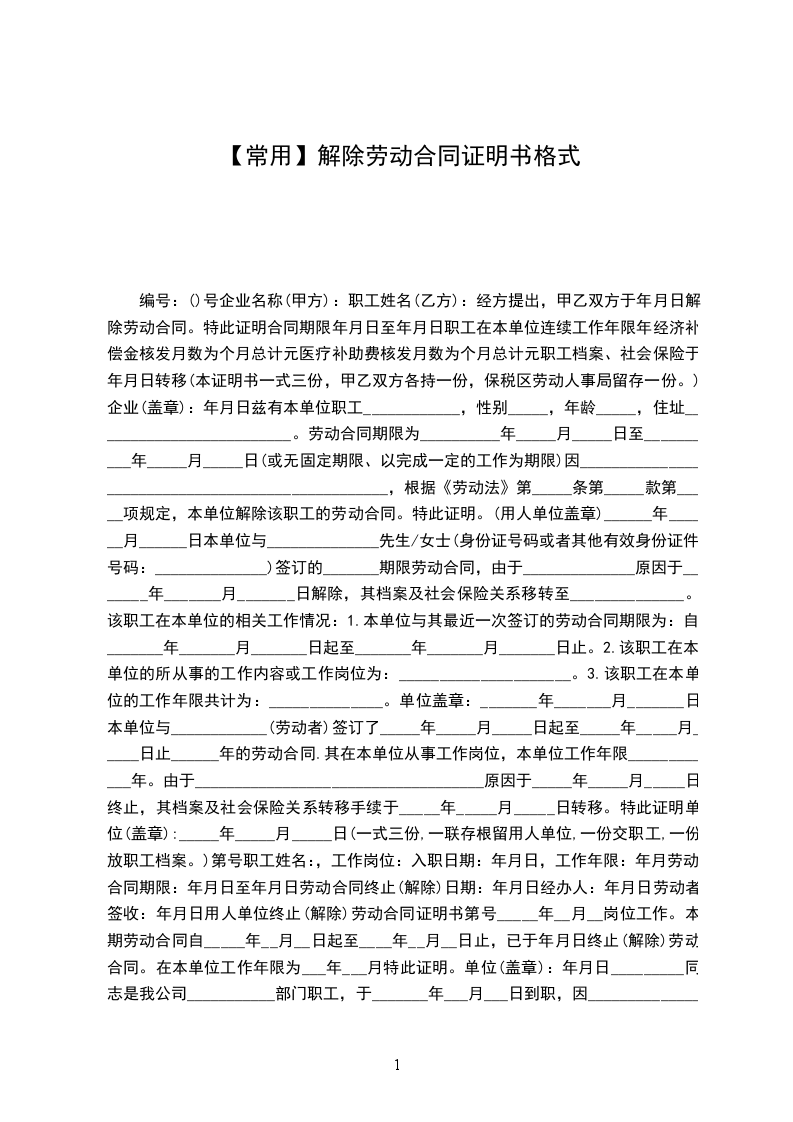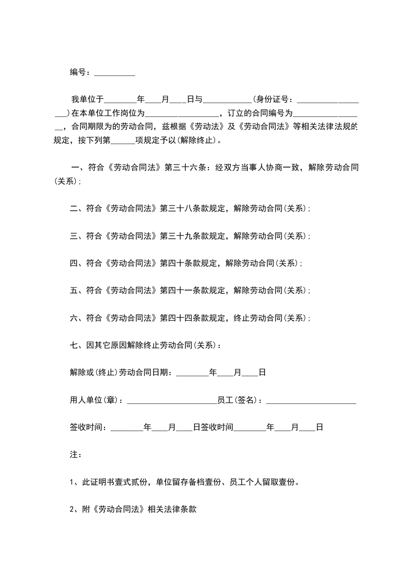 我单位于________年____月____日与____________(身份证号:__________________)在本单位工作岗位为__________________,订立的合同编号为__________________,合同期限为的劳动合同,兹根据《劳动法》及《劳动合同法》等相关法律法规的规定,按下列第______项规定予以(解除终止)。