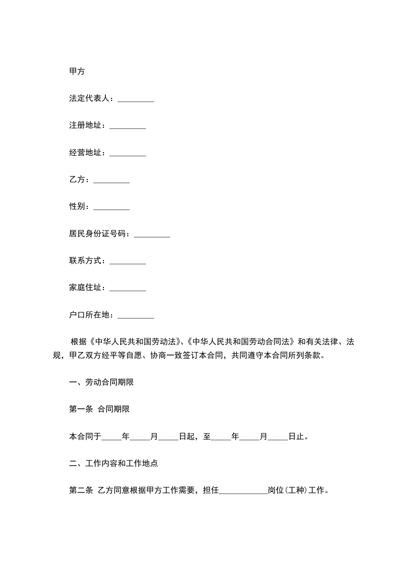 第三条 根据甲方的岗位(工种)作业特点,乙方的工作区域或工作地点为:__________________________