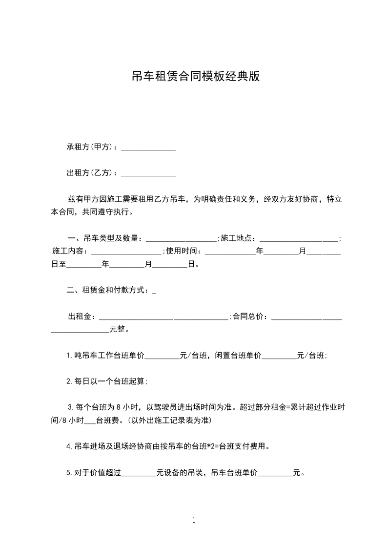 兹有甲方因施工需要租用乙方吊车,为明确责任和义务,经双方友好协商,特立本合同,共同遵守执行。