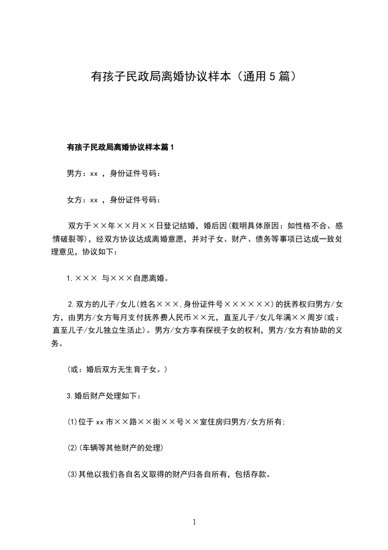 双方于________年________月________日在________________人民政府的民政部门登记结婚,婚后一个子女,因双方性格不和,无法共同生活,自愿离婚,经双方协商一致,订立离婚协议如下: