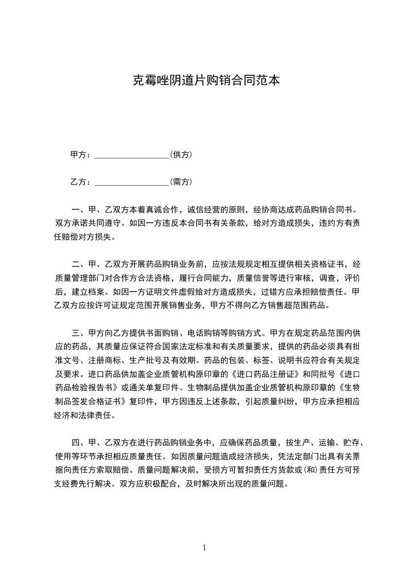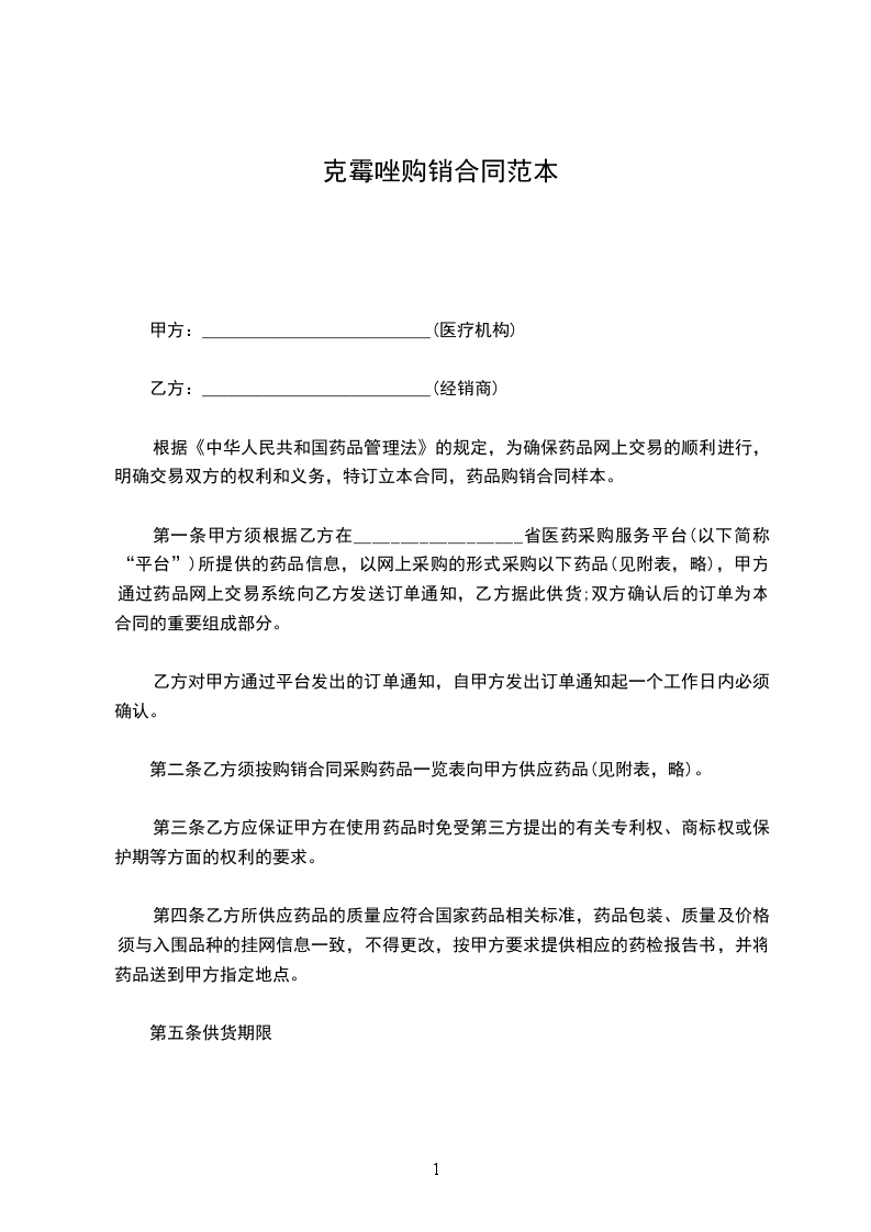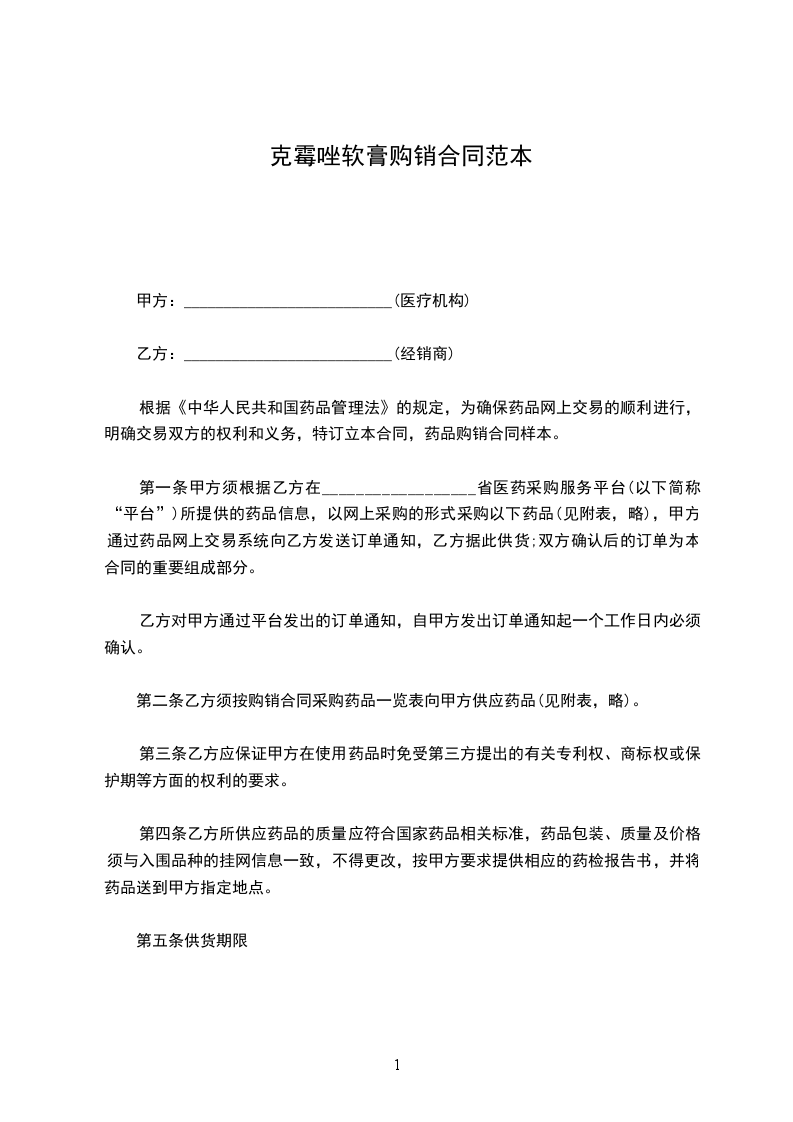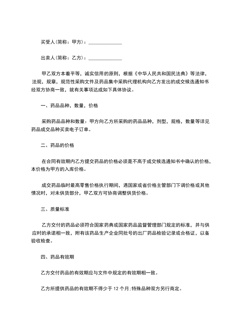 根据《中华人民共和国民法典》,甲、乙双方经协商确定,甲方向乙方购买药品。为明确双方责任和权利,特签订本合同,共同遵守。具体条款如下: