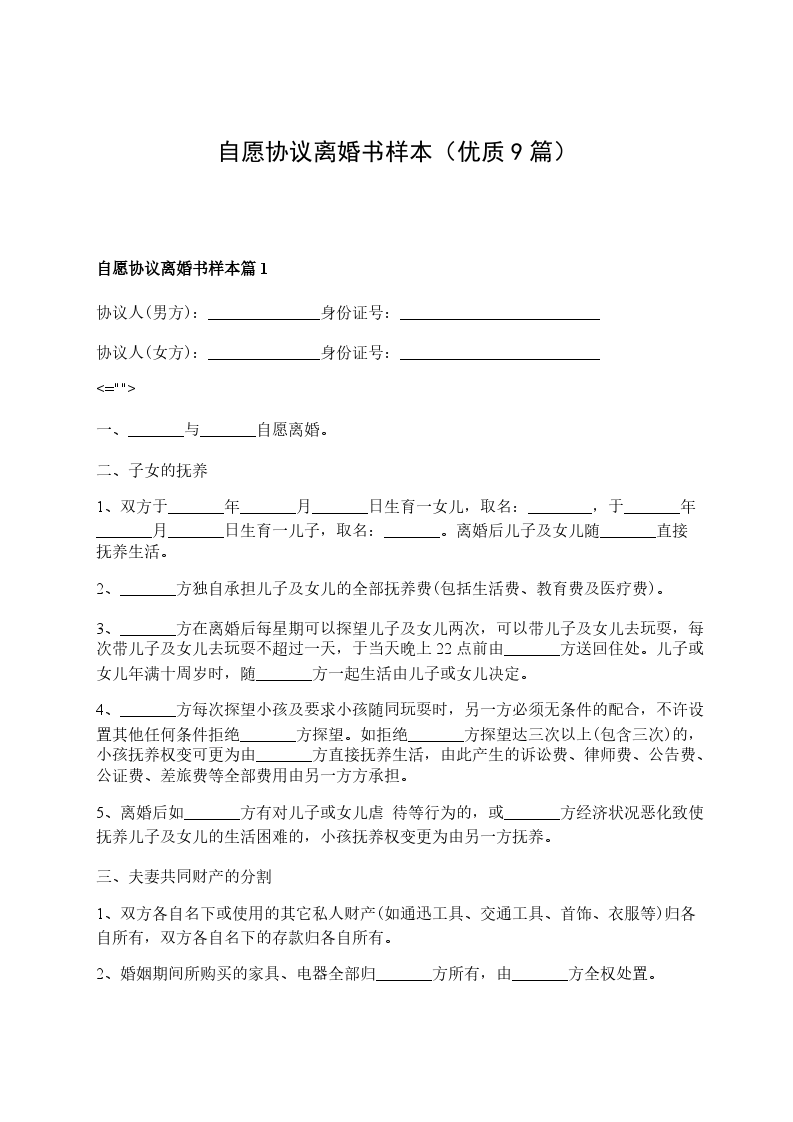 八、本协议一式三份,男、女双方各执一份,婚姻登记机关存档一份,自婚姻登记机颁发《离婚证》之日起生效。九、如本协议生效后在执行中发生争议的,双方应协商解决,协商不成,任何一方均可向相关人民法院起诉。