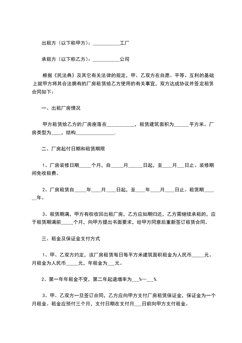 根据《民法典》及其它有关法律的规定,甲、乙双方在自愿、平等、互利的基础上就甲方将其合法拥有的厂房租赁给乙方使用的有关事宜,双方达成协议并签定租赁合同如下: